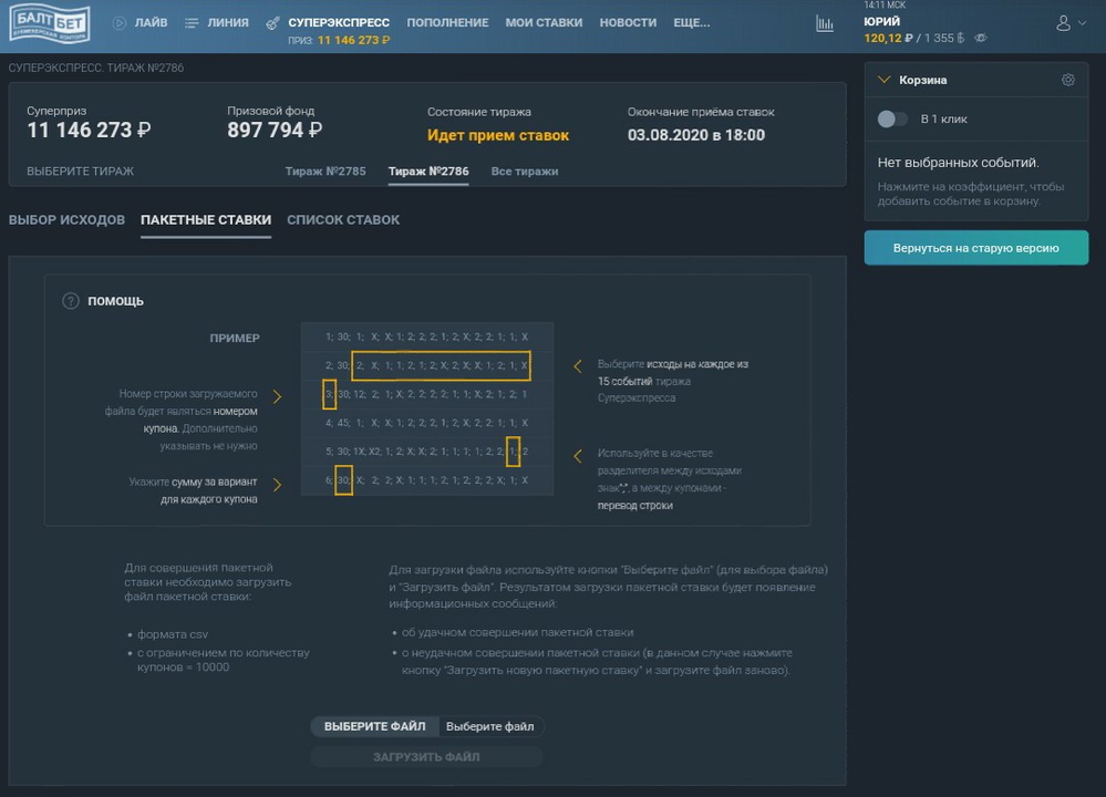 - Пакетные ставки. В разделе можно загрузить файл, где игроку следует указать исходы на 15 событий тиража. Приводится описание оформления файла. При заключении пакетных ставок действует ограничение – не более 10 000 купонов в загружаемом файле;