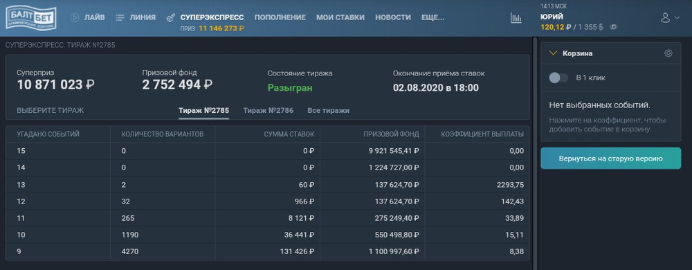 По каждому тиражу можно отслеживать промежуточные и итоговые результаты. В таблице указаны выигрышные категории, число угаданных вариантов, общая сумма ставок, размер части призового фонда и, что особенно удобно, коэффициент выплаты в каждой категории.