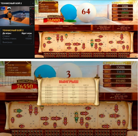 Во время розыгрыша в «Теннисный бой 1» квитанции игрока отображаются в нижней панели, основную часть занимает поле с анимацией морского боя. В первую очередь система выводит выигрышные квитанции.