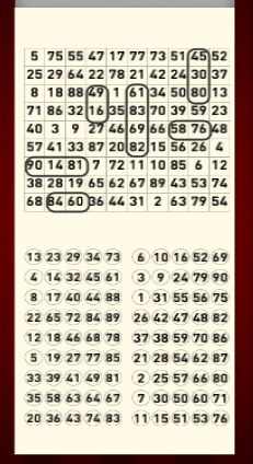 Розыгрыш проводится по квитанциям, каждая из которых разделена на два блока – 10х9 и 5х18, в которых в произвольном порядке указаны числа от 1 до 90.