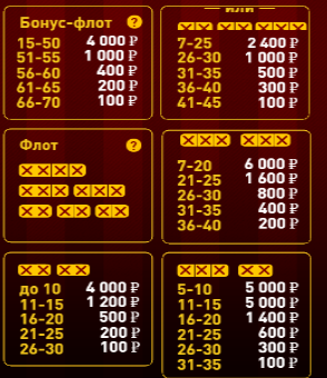 - Пример 4. Если я на 9 ходу потоплю двухпалубный корабль, а на 14-ом потоплю четырехпалубник, мой выигрыш составит 200 + 4000 = 4200 руб. Для кораблей разных размеров своя схема начислений выигрыша.