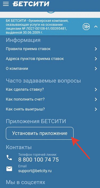 - Открыть официальный сайт букмекерской конторы «Бетсити» со смартфона и нажать кнопку «Установить приложение» из подвала сайта.