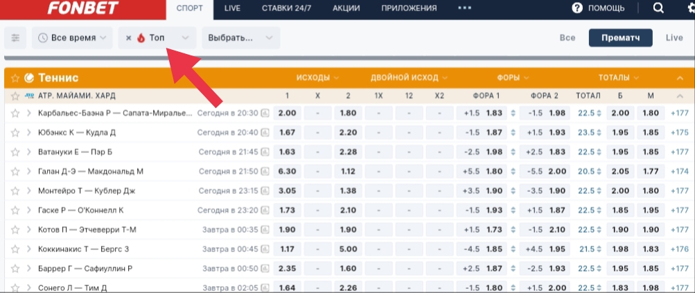 События с богатым выбором статистических рынков доступны в разделе «Топ». Варианты видов спорта здесь, как правило, ограничены самыми популярными дисциплинами, хотя нередко можно встретить и второстепенные – футзал, гандбол и т.д.
