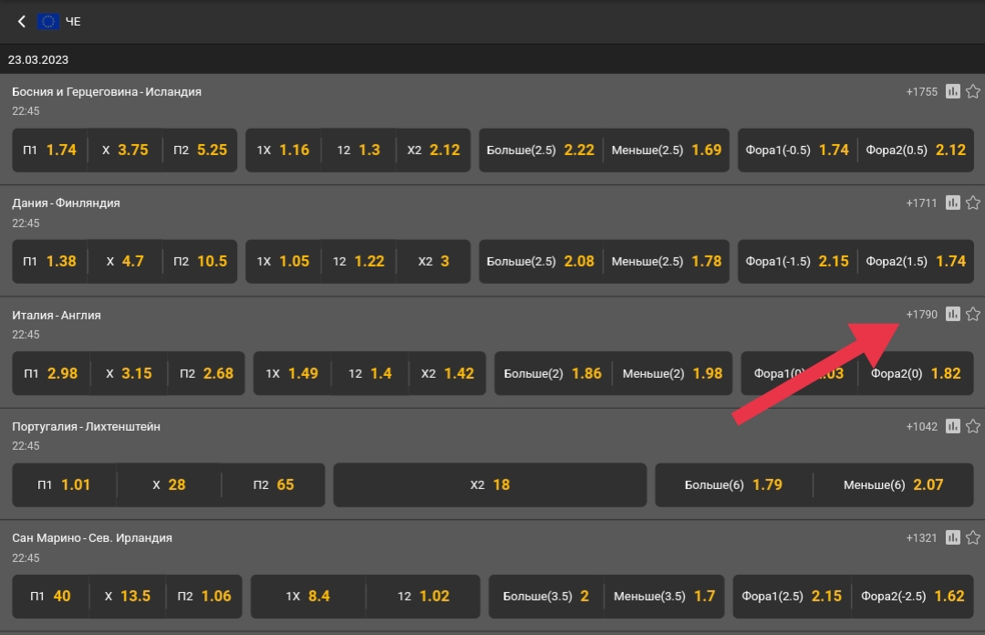 - Большое количество рынков на топовые спортивные события. Максимум предлагается на матчи крупных европейских футбольных чемпионатов – свыше 1900 вариантов исходов в прематче;