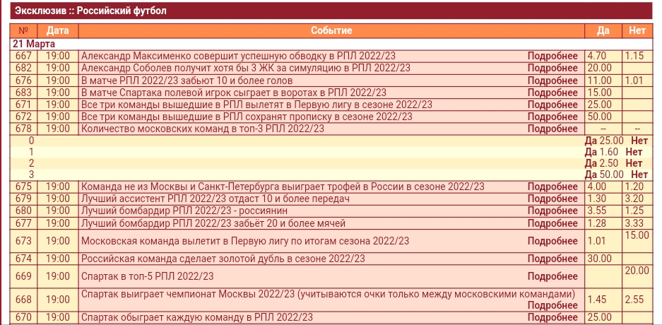 Роспись эксклюзивных предложений формируется в зависимости от игрового календаря популярных турниров. Широкий выбор предлагается в дни проведения очередных туров европейских футбольных чемпионатов, а также событий крупных соревнований в хоккее, теннисе, баскетболе и MMA.
