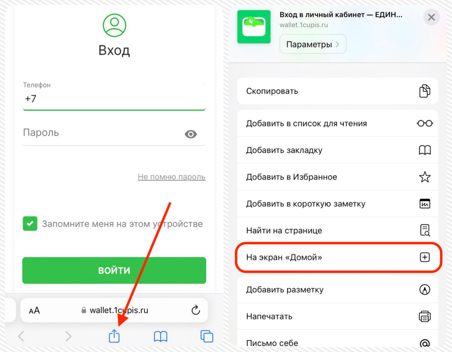 • На мобильном устройстве iOS заходим через Safari на сайт ЦУПИС => переходим на страницу авторизации для входа в кошелек https://wallet.1cupis.ru/main;
