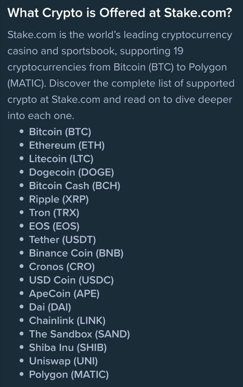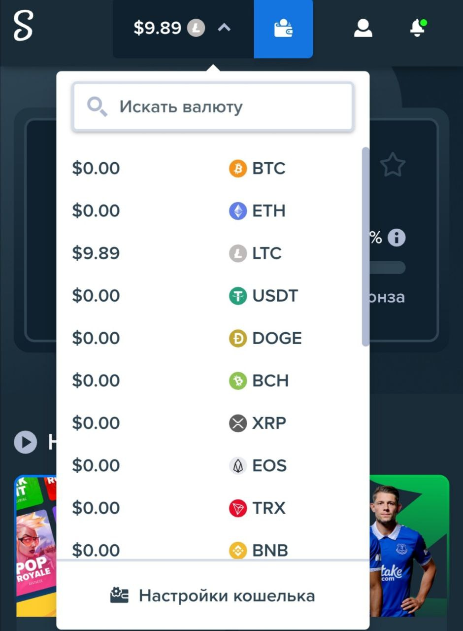 Если же есть желание завести средства не в тизере – Stake поддерживает депозиты в огромном количестве криптовалют: BTC, TRX, ETH, LTC, DODGE, BCH, XRP, EOS, DAI и т.д...