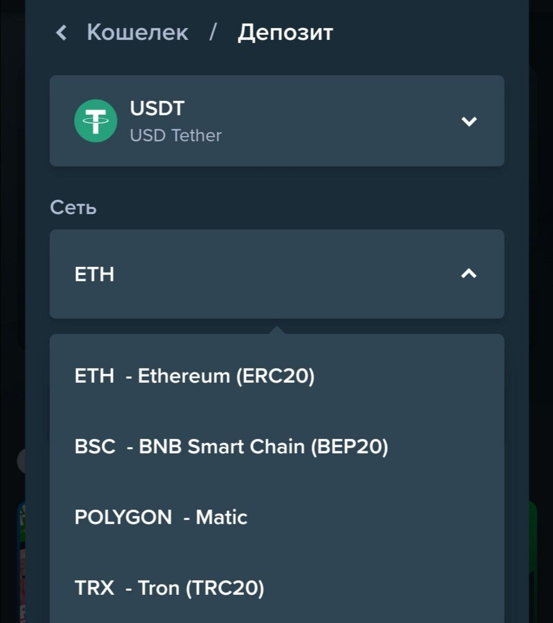 После перехода к разделу депозитов – предлагается выбрать крипту, по умолчанию указаны USDT, сети – на любой вкус (для экономии комиссий).