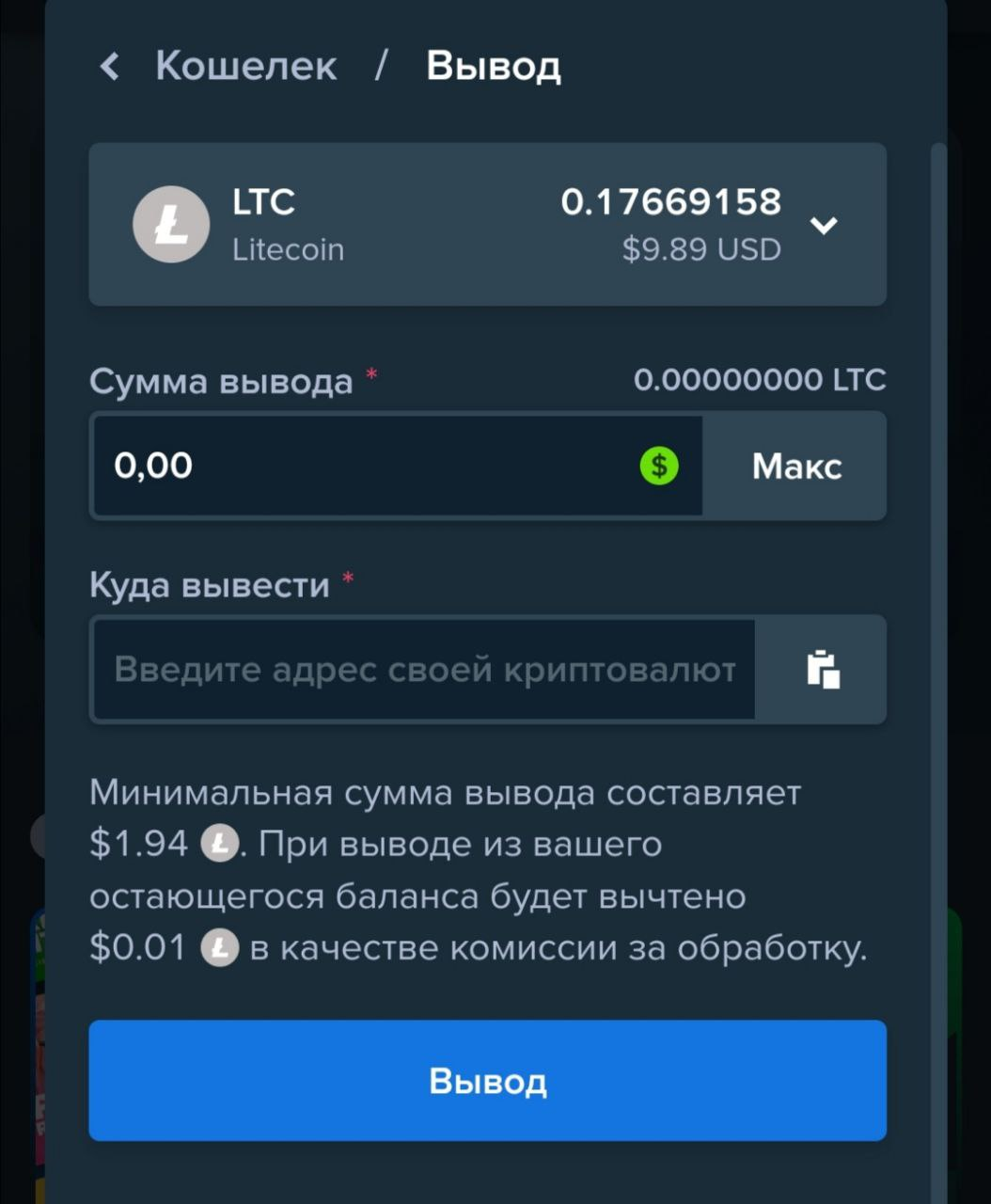 На практике процесс тоже несложный. Нужно зайти в кошелек, открыть вкладку выплат и все комиссии отобразятся непосредственно на этапе формирования вывода (сразу в валюте счета). Для лайткоинов – 1 цент: