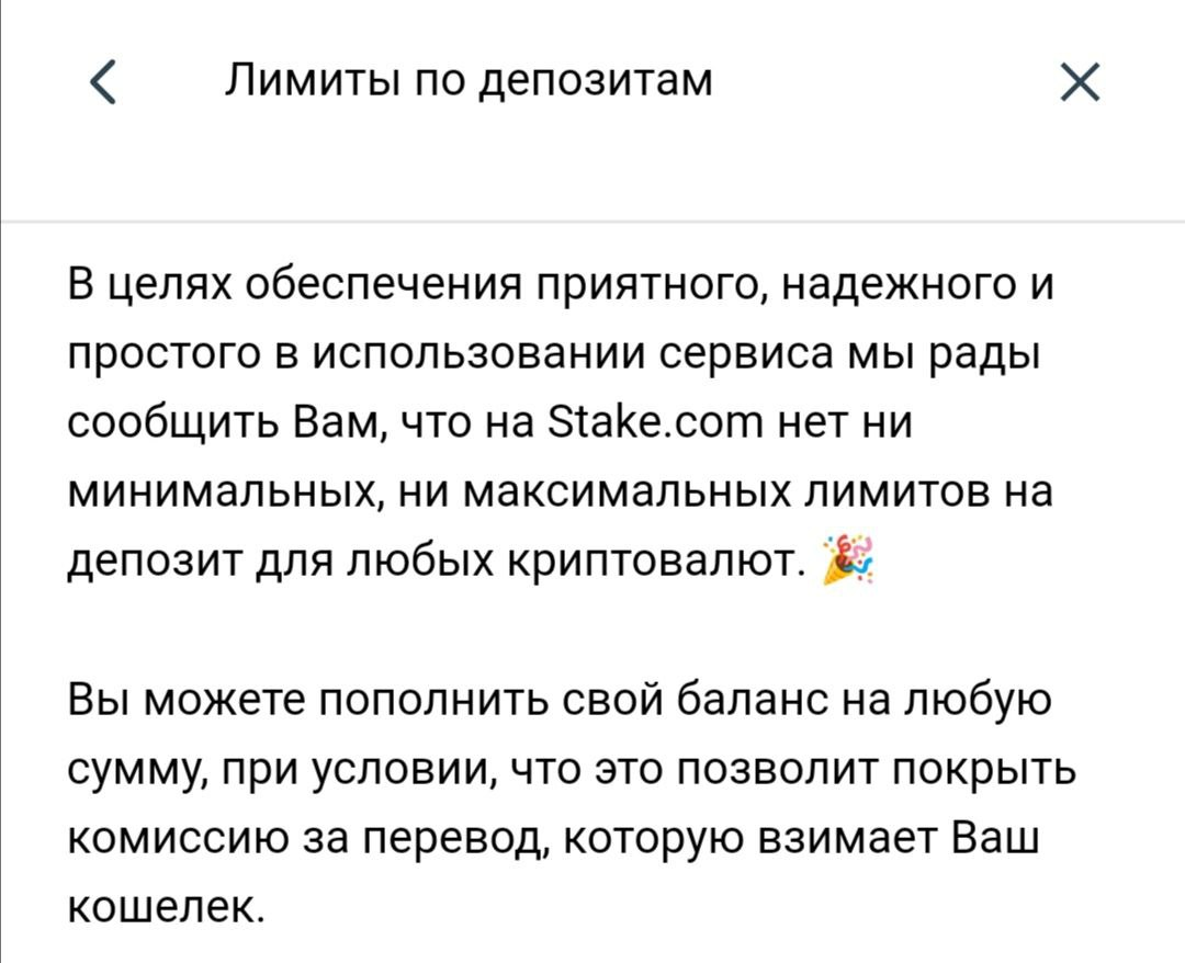 Одним из преимуществ платформы Stake является отсутствие ограничений на сумму депозита. Можно внести цент, а можно – миллион. Отсутствие лимитов прописано в правилах.