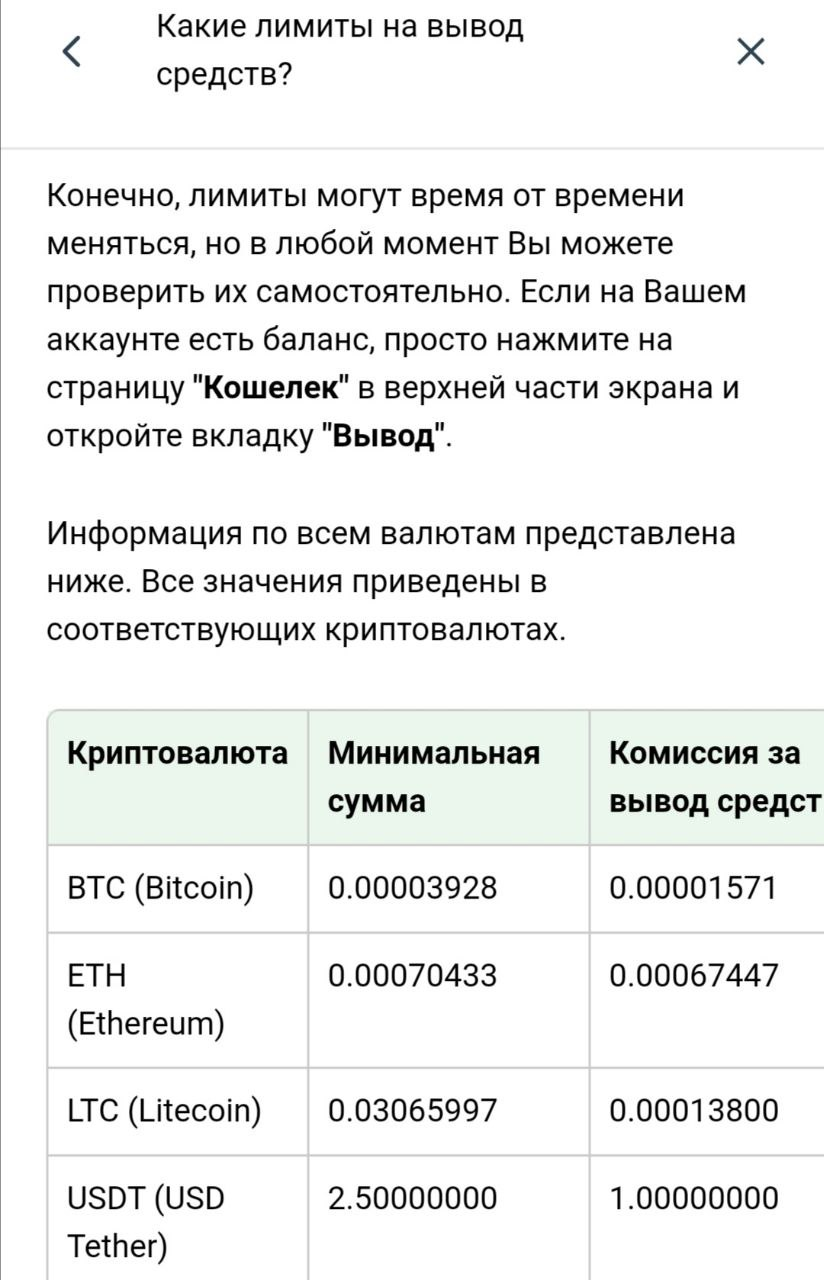 Отдельной статьей есть таблица, где для каждой криптовалюты указаны и комиссия, и минимальная сумма, доступная к выводу (см. скриншот). Например, для USDT минимальная выплата 2,50 USDT и фиксированная комиссия 1 USDT.