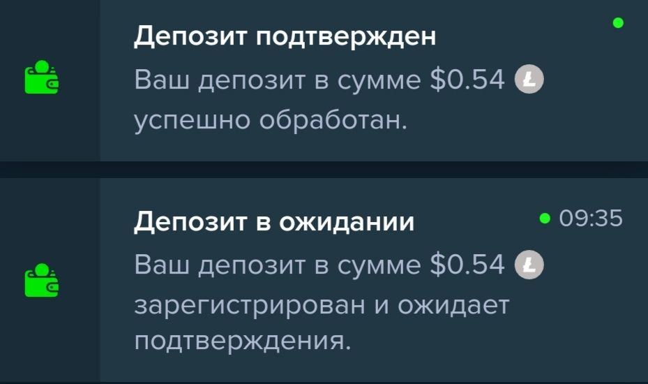 Например, при пополнение на 0.01 LTC оценочная стоимость составляла 0.5168$, но при зачисление пришло уведомление о пополнение на 0.54$. Это не значит, что мне было зачислена больше денег, мне пришли отправленные 0.01 LTC, но поскольку курс LTC по отношению к доллару изменился, то и оценочная стоимость в USD изменилась.