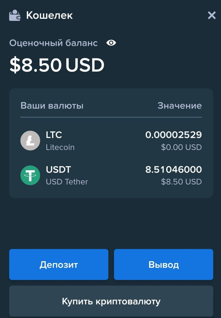 В дальнейшем, все операции могут происходить в выбранной для отображения валюте, например USD. Но по факту, операции будут происходить с выбранной криптовалютой.