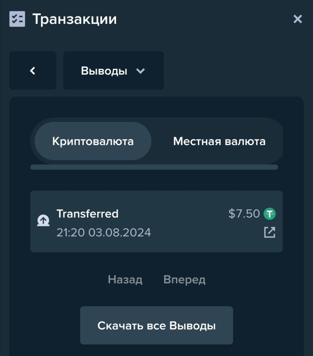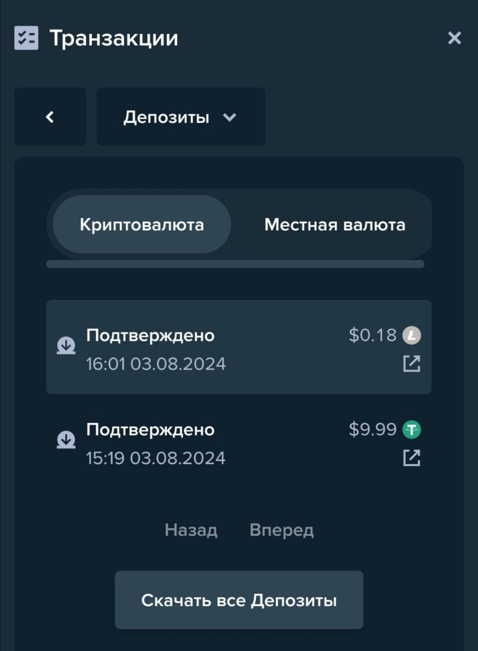 История переводов во всех криптовалютах доступна к просмотру через общее меню транзакций внутри игрового кошелька.