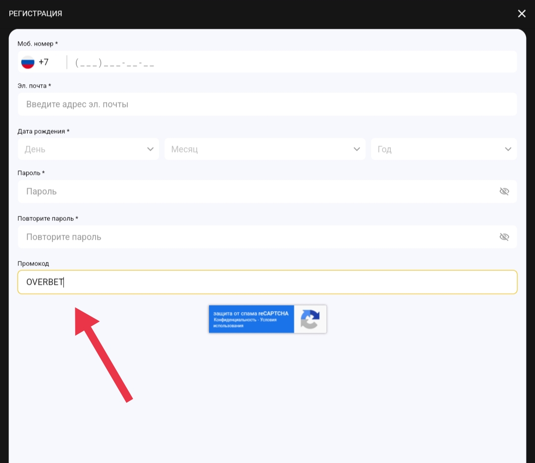 💡По условиям акции вы можете получить бонус, равный 100% от суммы первого депозита, но не более 15 000 рублей. Если при регистрации указать промокод «OVERBET», максимальная сумма увеличится до 25 000 рублей.