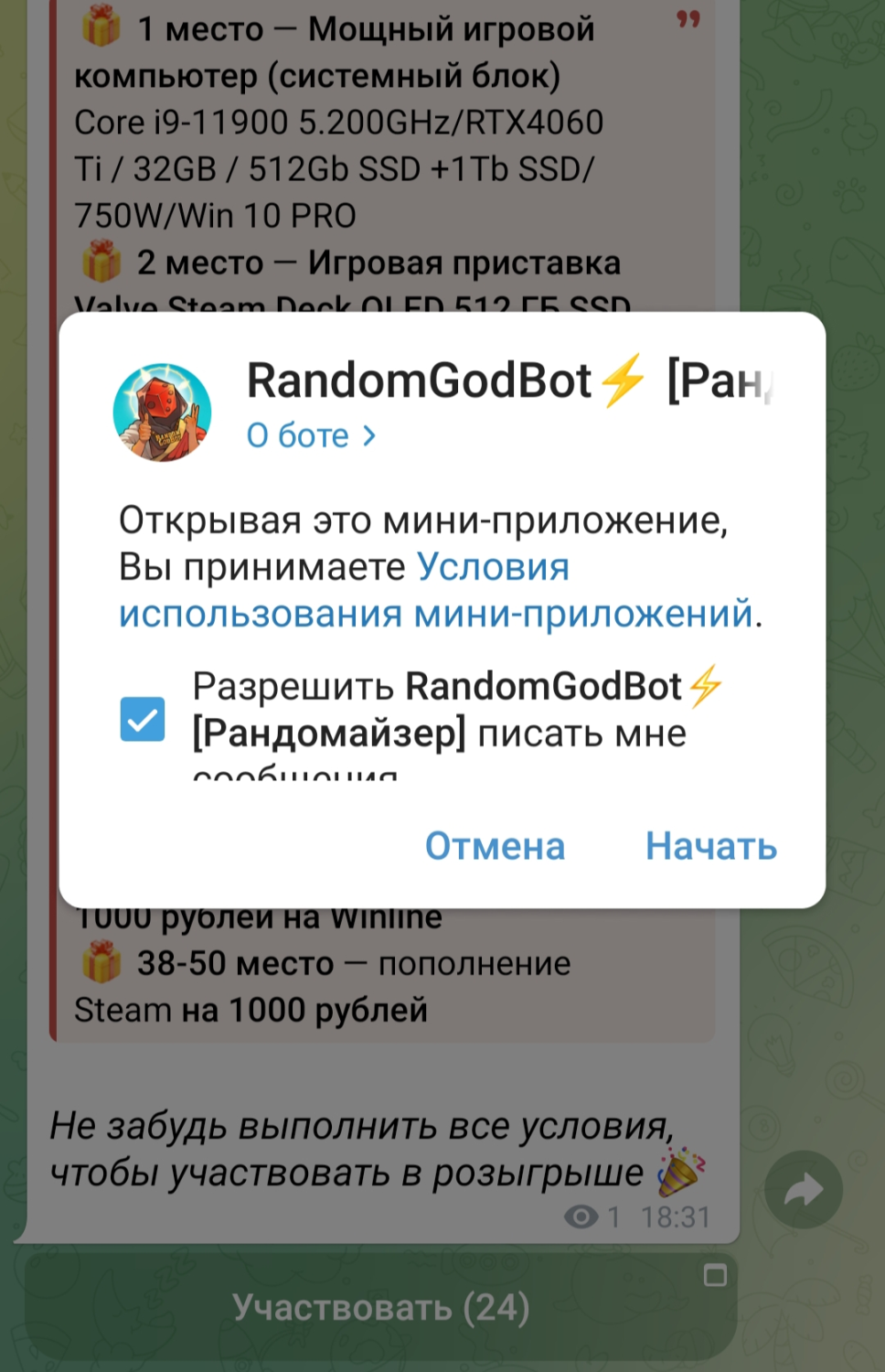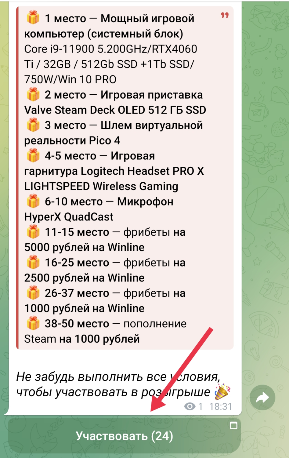 После подписки нужно будет перейти в пост акции в Telegram (в канале Winline Esports) и нажать кнопку «Участвовать».