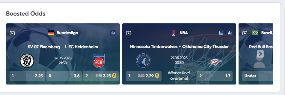 В разделе «Sports betting» сразу обращает на себя внимание верхний рекламный блок «Boosted Odds»