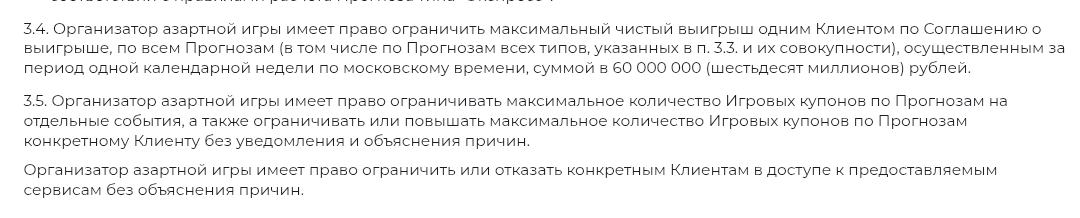 PARI может без объяснений ограничить клиенту максимальный выигрыш (до 60 млн рублей), лимиты на ставки и другие параметры. У PARI есть пункт, что окончательное решение в спорах принимает букмекер.