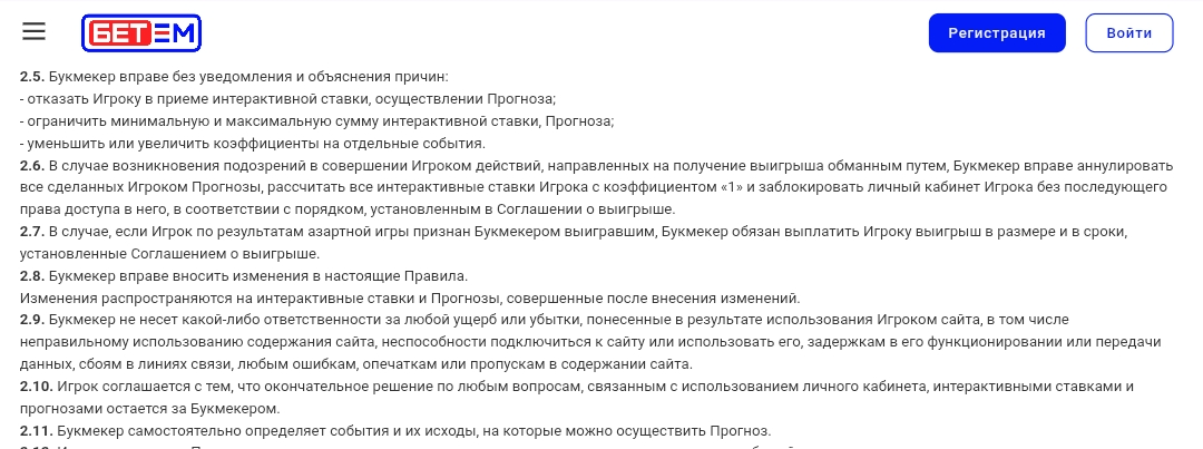 При подозрении в «мошеннических действиях» (также без конкретики) букмекер вправе заблокировать личный кабинет без возможности восстановления. Таким образом, делать ставки в «Бет-М» станет невозможно.