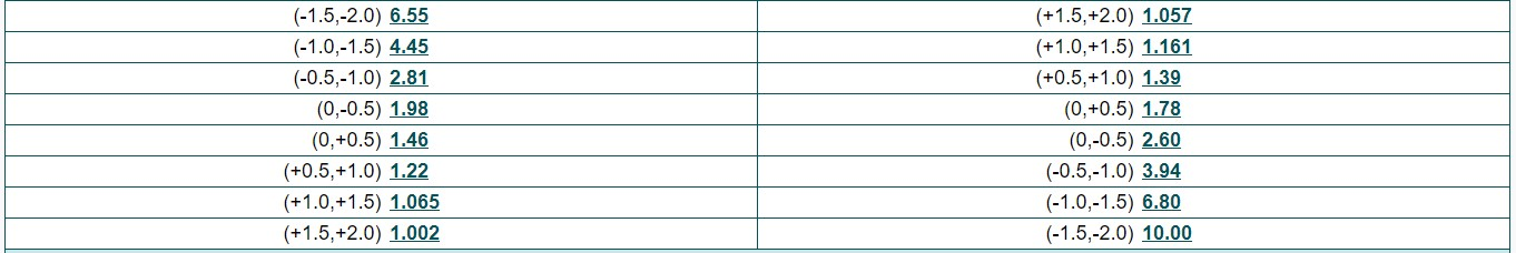 Азиатская фора делит ставку на две части: целую и половинчатую. Например, фора (-1,75) разбивается на (-1,5) и (-2), а фора (-1,25) — на (-1) и (-1,5).