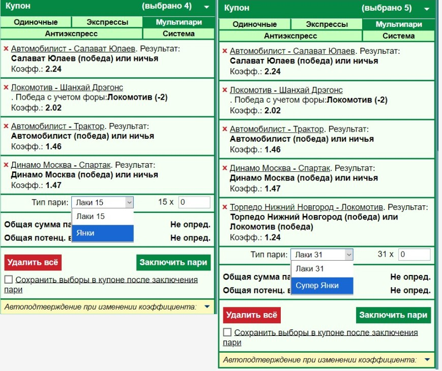 «Янки» и «Супер Янки» — это системы ставок из 4 и 5 событий. Чтобы получить выплату, должно сыграть минимум два события. «Янки» состоит из 11 комбинаций, «Супер Янки» — из 26. Если ставить 1 рубль на каждую комбинацию, общая сумма ставки составит 11 рублей для «Янки» и 26 рублей для «Супер Янки».