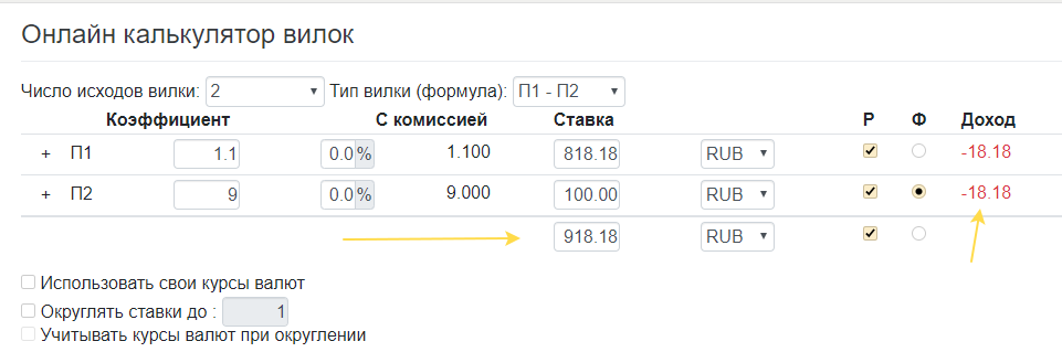 Берем тот же самый матч и рынок. Но в этот раз я буду «перекрывать» ставку, сделанную на П2 с коэффициентом 9,0, на такую же сумму – 100 руб. Для «перекрытия» этой ставки мне уже потребуется 818,18 руб. Общая сумма всех ставок выходит 918,18 руб. Считаем потерю от «перекрытия»: 918,18 × 0,0202 × (1 – 0,0202) = 18,17 руб.. Проверяем через тот же калькулятор: