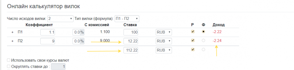 Я сделал ставку 100 руб. на П1 с коэффициентом 1,1. Для того чтобы мне «перекрыть» эту ставку, нужно поставить 12,22 руб. на П2 с коэффициентом 9,0. Общая сумма всех ставок составила 112,22 рубля. Таким образом, используя нашу формулу, мы получаем потерю от «перекрытия»: 112,22 × 0,0202 х (1 – 0,0202) = 2,22 руб.. Проверяем через специальный калькулятор: