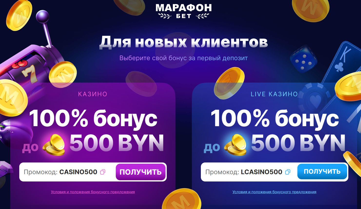 Казино «Марафон» даёт новичкам шанс удвоить первый депозит! Пополняйте счёт с промокодом и получайте 100% бонус – до 500 BYN для игры в Казино или Live Казино.