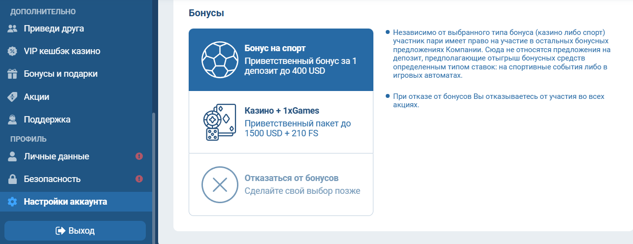 Если при регистрации вы отказались от бонуса или выбрали бонус в Казино, то перед первым депозитом вы еще можете его сменить в разделе «Настройки аккаунта».