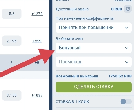 !! Обратите внимание, что в зачет идут только ставки, заключенные на бонусные средства. Выбрать счет, с которого будут оформляться ставки, нужно непосредственно в купоне при оформлении пари.