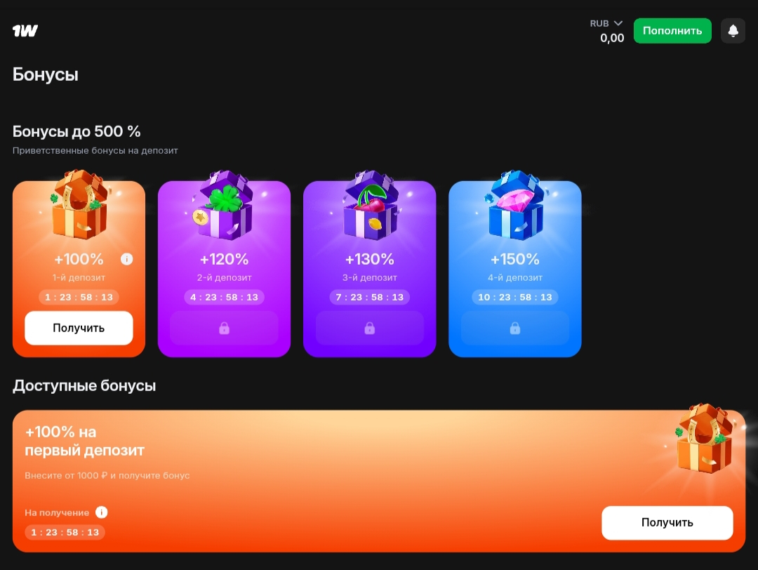Бонус 1win состоит из 4-х бонусов на первые 4-и депозита с разным процентом начисления: 100%, 120%, 130% и 150% от суммы пополнения. Никаких +500% к депозиту, о которых говорится в акции, здесь нет. Вы получаете от 100% до 150% от суммы пополнений.