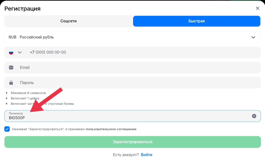 - Пройти регистрацию в 1win с промокодом BIG500P;