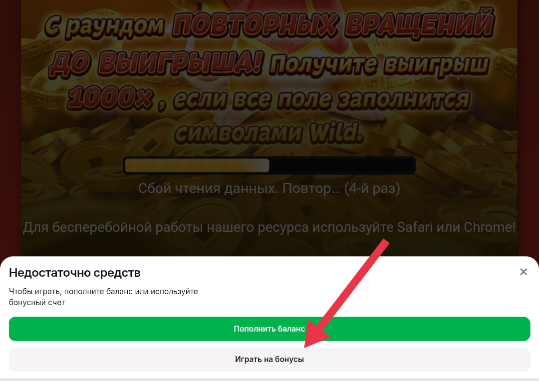Когда деньги с основного счета проиграны, активируется кнопка «Играть на бонусы».