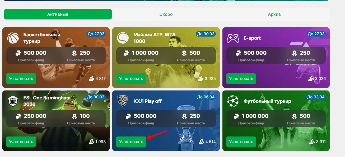 - Выбрать турнир «КХЛ Play off» и нажать кнопку «Участвовать».