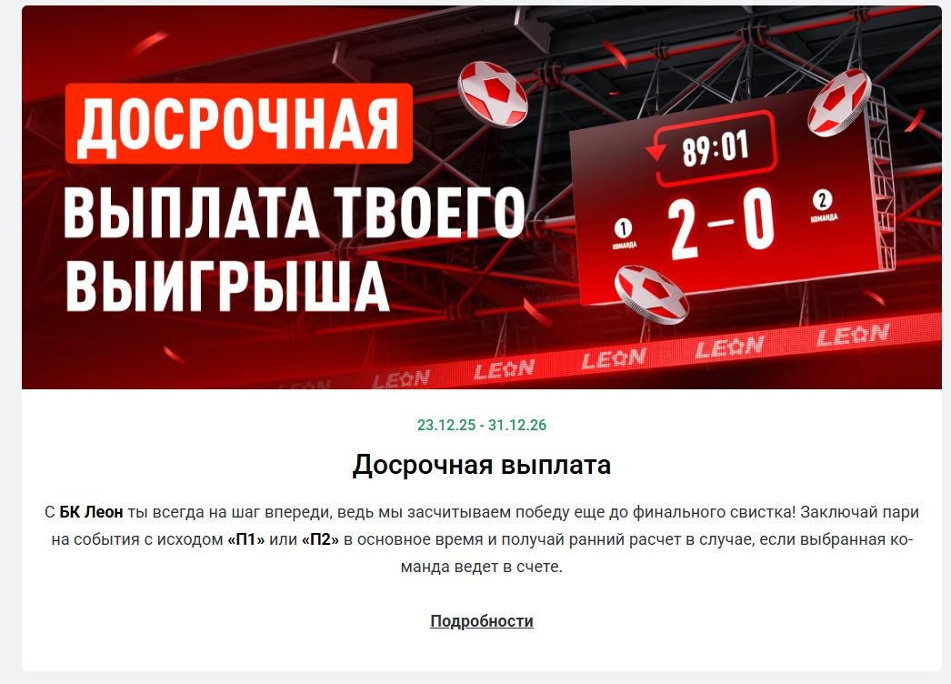 Букмекерская контора «Леон» предлагает клиентам специальную акцию с досрочной выплатой ставок на футбол и хоккей. Механика предложения проста: если выбранная команда по ходу матча получает комфортное преимущество, пари автоматически рассчитывается выигрышем, не дожидаясь финального свистка.