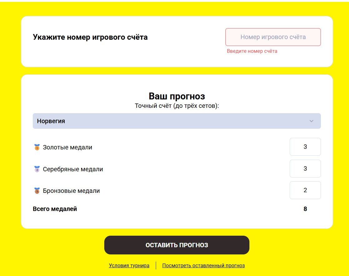 - На странице акции указать номер игрового счёта, и страну, которая на следующий день после подачи прогноза займет первое место в общем медальном зачете;