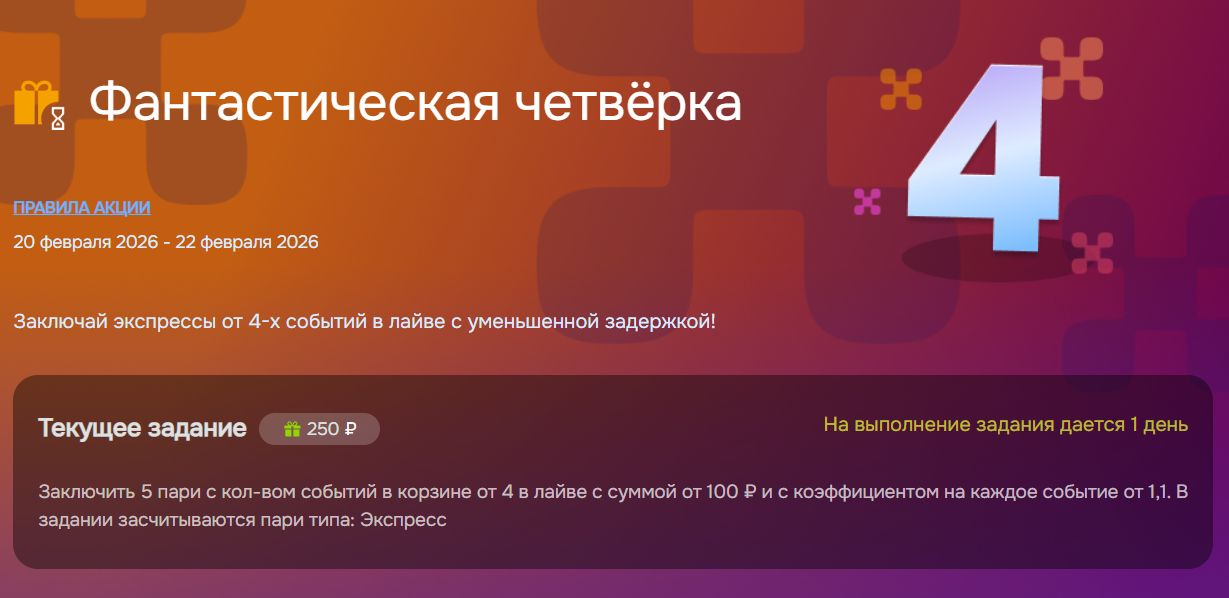 - Заключить пять экспрессов (от четырёх событий в лайве с уменьшенной задержкой) в течение 1 дня с момента активации участия (или до конца акции) с указанными в задании коэффициентами и суммами.