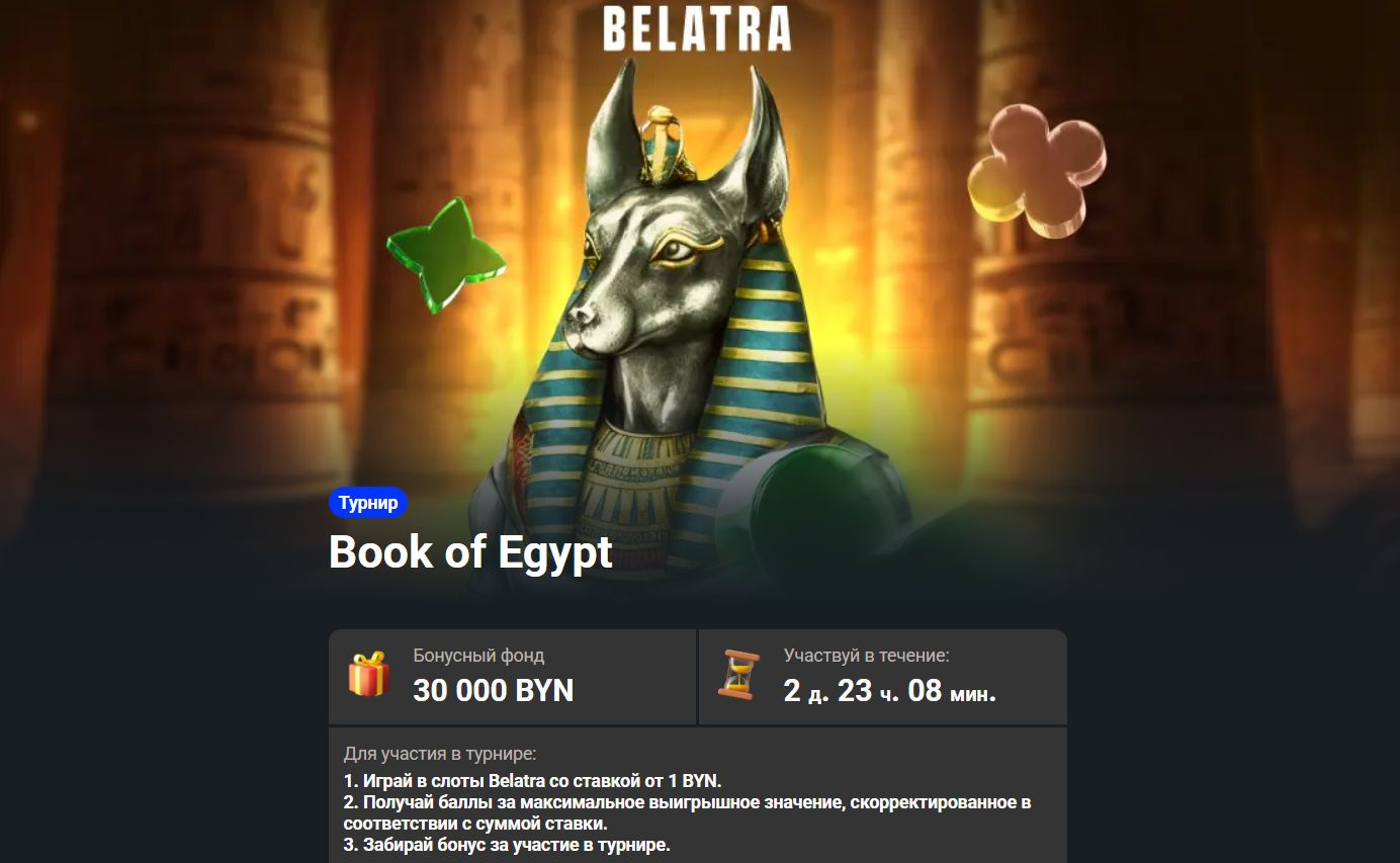 Betera совместно с провайдером Belatra проводит турнир «Book of Egypt», рассчитанный на активных поклонников слот-игр. Участникам предлагается соревноваться по системе набора баллов и претендовать на часть общего призового фонда в размере 30 000 BYN. Победителем станет игрок, показавший наилучший результат по итогам турнира.