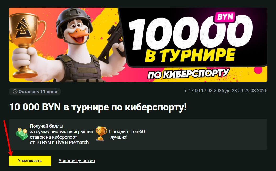 - Нажать «Участвовать» на странице акции (можно найти в разделе турниров);