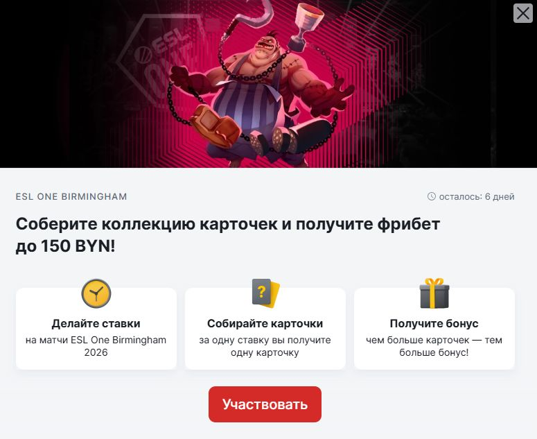 Букмекерская компания «Фонбет» проводит акцию к турниру ESL One Birmingham 2026. В рамках предложения игроки смогут собирать коллекционные карточки команд и обменивать их на фрибет номиналом до 150 BYN. Акция доступна всем клиентам букмекера и не требует угадывать исходы матчей — карточки начисляются за сами ставки.