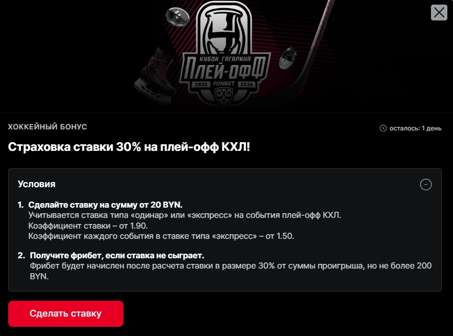 Букмекерская контора «Фонбет» проводит акцию для хоккейных болельщиков, которая сделает ваши ставки на плей-офф КХЛ ещё безопаснее. Участники могут застраховать свои ставки на 30%, получив фрибет до 200 BYN в случае проигрыша.