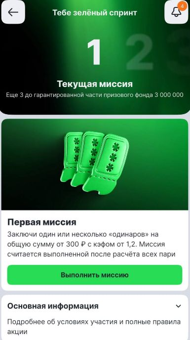БК «Лига Ставок» проводит акцию «Зелёный спринт» с механикой ежедневных заданий, в рамках которой пользователи могут получить фрибеты до 5000 рублей. Общий призовой фонд составляет 30 000 000 рублей и распределяется между участниками в зависимости от количества выполненных миссий.