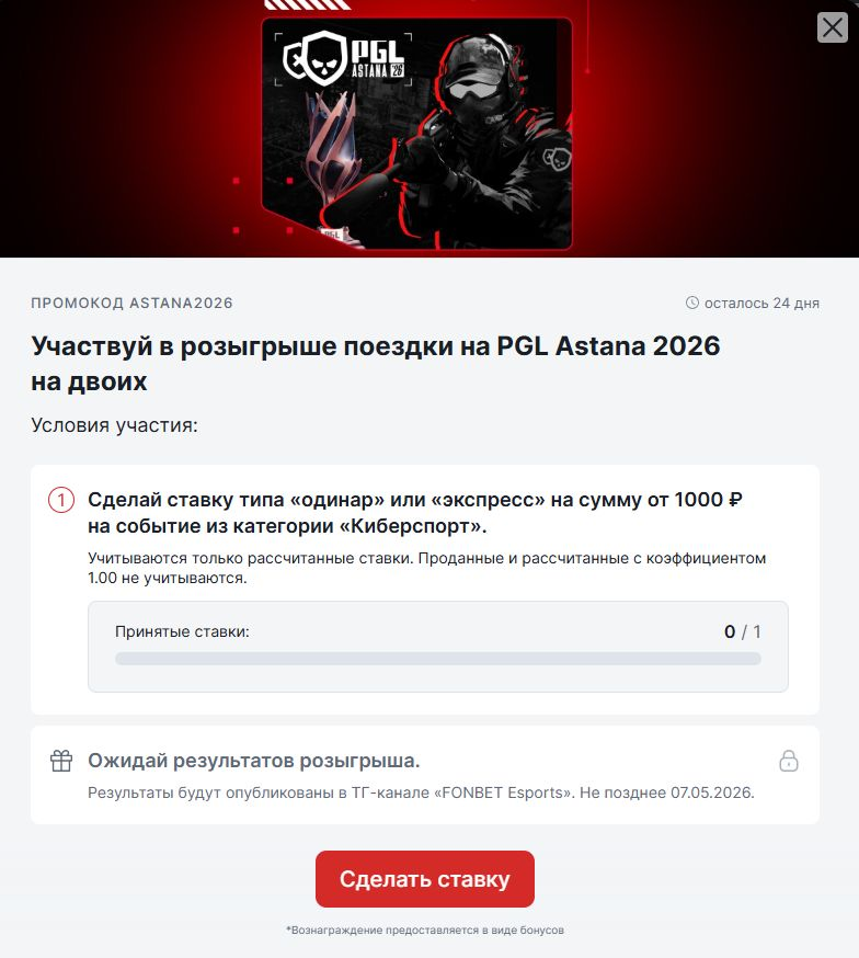 «Фонбет» проводит акцию для любителей киберспорта с розыгрышем крупного призового фонда и поездки на плей-офф PGL Astana 2026. Участникам предлагается активировать промокод и оформить пари, чтобы получить шанс на один из 10 призов.