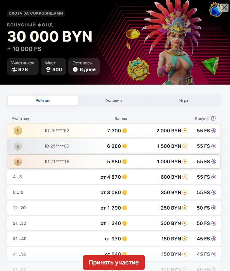 - 251–300 места – 30 BYN + 25 фриспинов (номинал 0.20 BYN, отыгрыш ×25)
