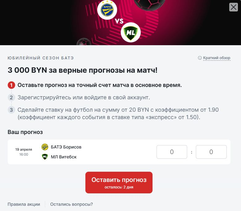 - Перейти на страницу акции и указать прогноз на точный счёт матча БАТЭ – «Витебск».