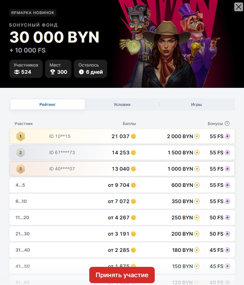 - 251–300 места – 30 BYN + 25 фриспинов (номинал 0.20 BYN, отыгрыш ×25)