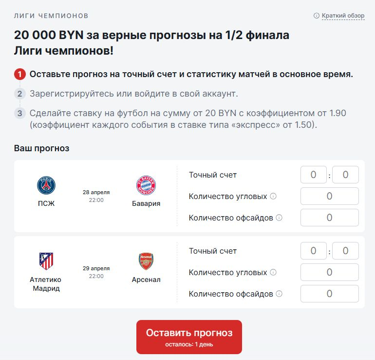 Букмекерская компания «Фонбет» проводит розыгрыш фрибетов на общую сумму 20 000 BYN. Чтобы побороться за призы, достаточно сделать прогнозы на точные счета и статистику полуфиналов Лиги чемпионов и оформить ставку. Участников ждут фрибеты до 3600 BYN, которые будут распределены между теми, кто угадает результаты.