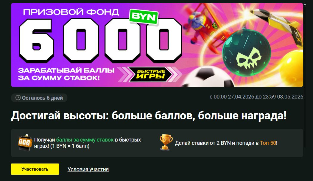 Maxline проводит турнир для любителей быстрых игр под названием «Достигай высоты: больше баллов, больше награда». Участников ждёт динамичная гонка за очками, возможность получить щедрые денежные бонусы и шанс войти в топ-50 лучших. Общий призовой фонд – 6 000 BYN.