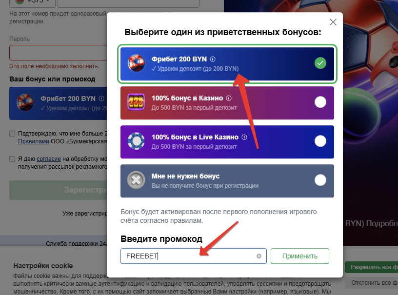- Зарегистрироваться на сайте «Марафонбет», указав промокод FREEBET200, либо выбрав этот бонус в форме регистрации (см. ниже);
