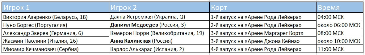 Для российской аудитории болельщиков, в центре внимания битвы Даниила Медведева с Нуно Боргесом и Анны Калинской с Жасмин Паолини. Однако есть ведь ещё и другие классные матчи.